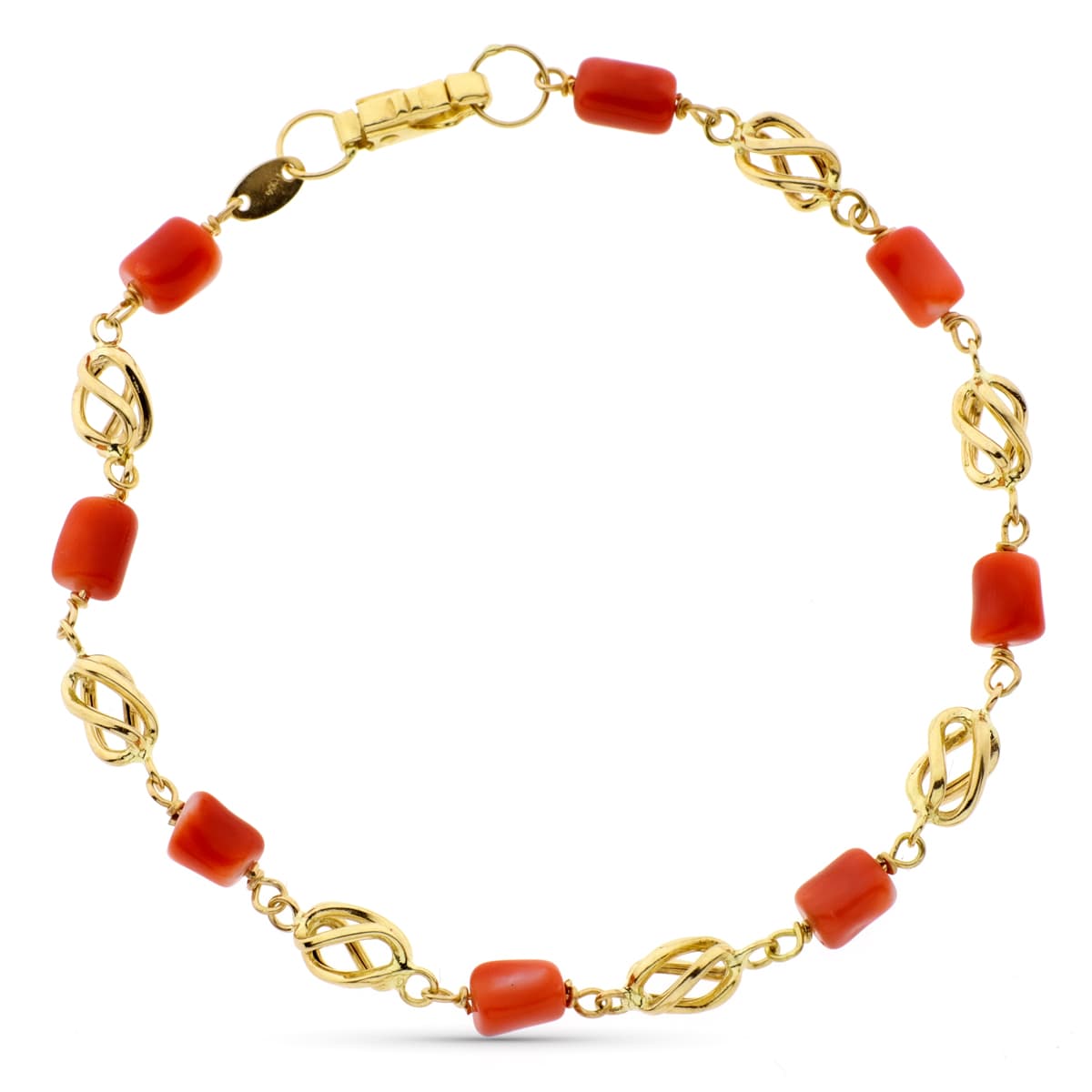 18K PULSERA ORO AMARILLO CON JAULAS Y CORAL FINO JAPONES 19 CM