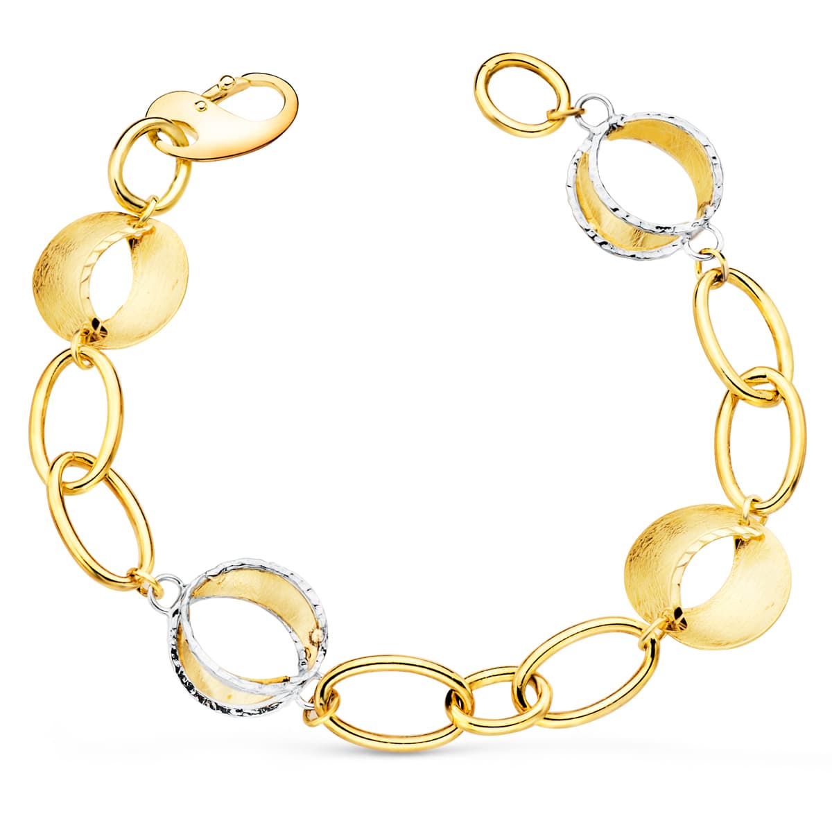 18K PULSERA ORO BICOLOR ESLABONES OVALES Y MOTIVOS REDONDOS RAYADOS. 20 CM