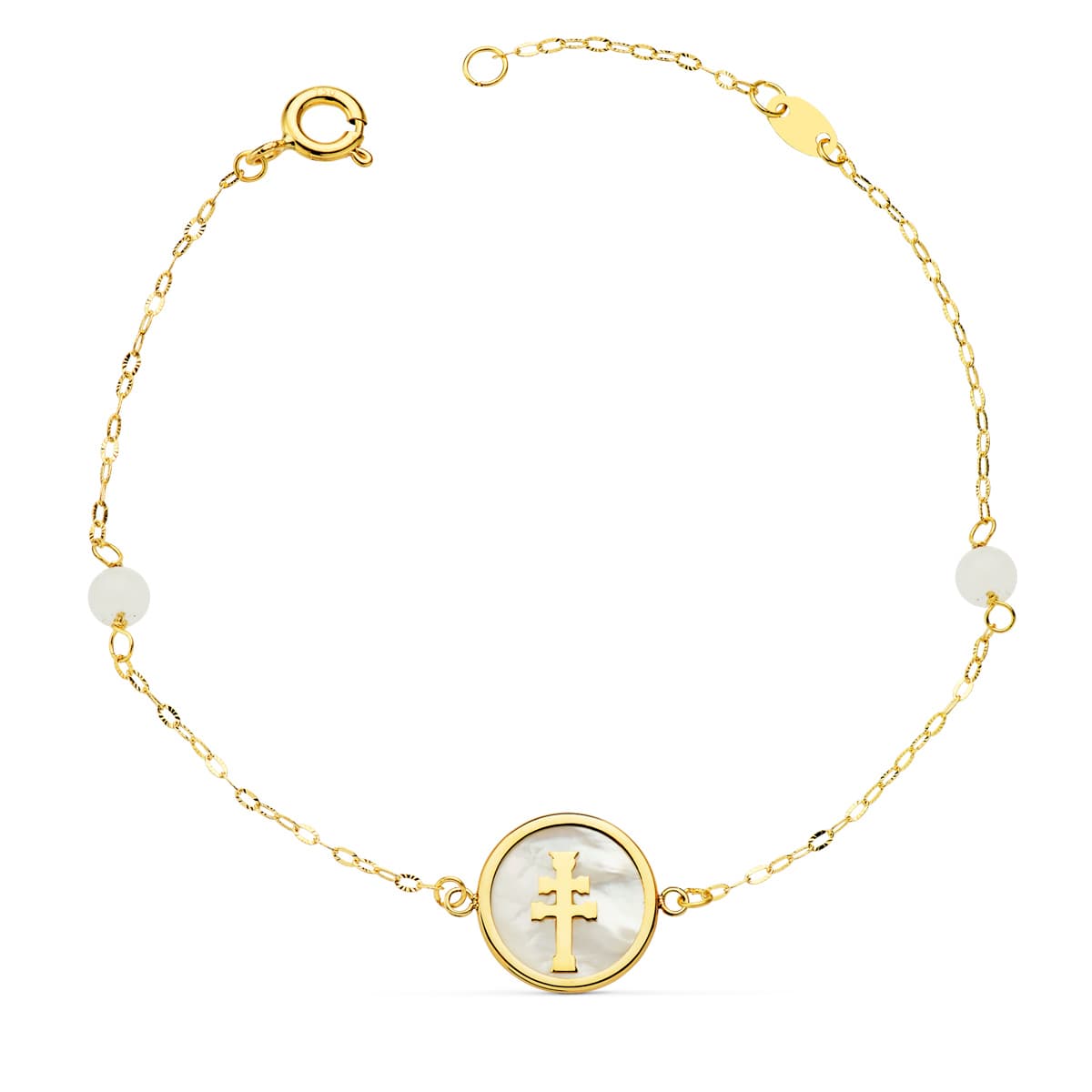 PULSERA NACAR CON CRUZ CARAVACA 12 MM Y BOLAS JADE 4 MM CADENA 18 + 2.5 CM
